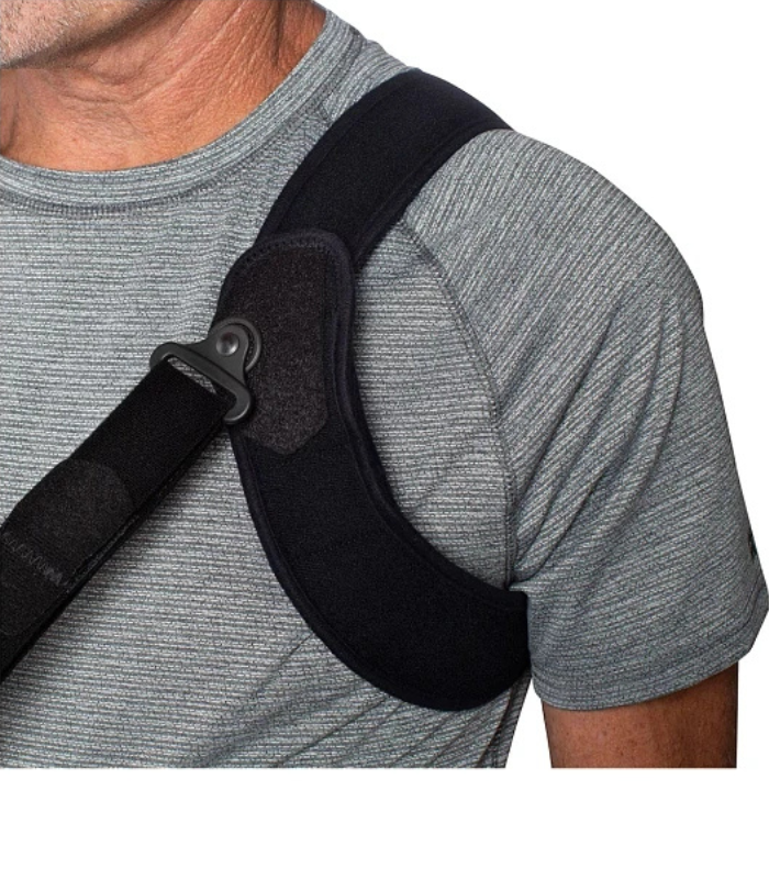 Low profile, and adjustable ring easily slides over the non-injured shoulder, helping to evenly distribute weight and take pressure off neck