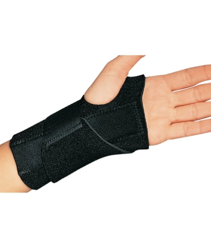 Wraparound neoprene brace provides compression and support for wrist sprains and strains. Removable contoured aluminum palmar stay. Inside contact closure allows for ease of application and proper fit. Durable construction withstands wear during exercise, sporting activities and repetitive work conditions.